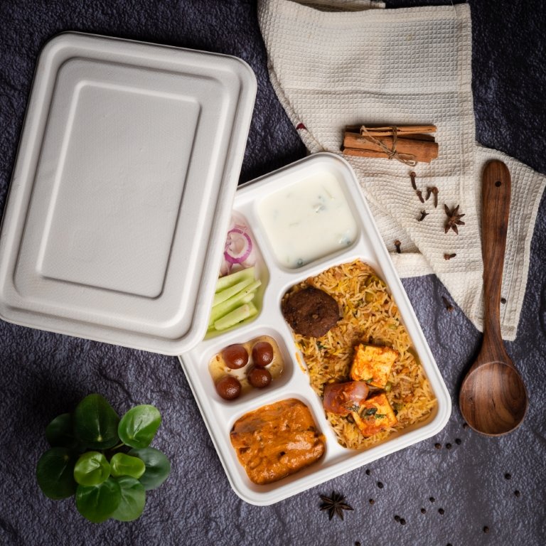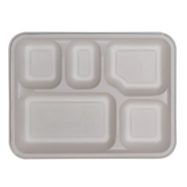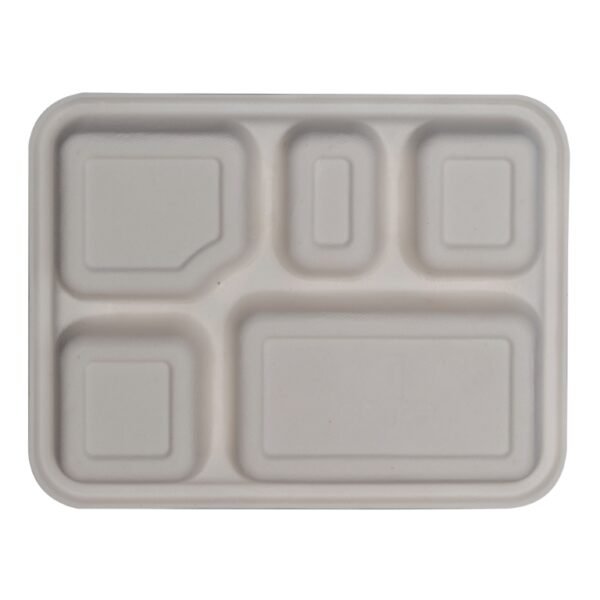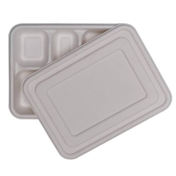 The 5 Cp Tray with Lid is an eco-friendly disposable food tray made from 100% natural bagasse, a sustainable byproduct of sugarcane processing. With estimated dimensions of 250 × 200 × 50 mm, this tray is perfect for serving or packaging meals for restaurants, catering, parties, or home use. Each tray weighs approximately 35 grams and comes in sleeves of 20 units. The fitted lid ensures secure storage and transport, keeping food fresh and protected. Fully compostable and sturdy, this white tray offers a sustainable alternative to plastic containers while presenting meals in a clean and professional way.